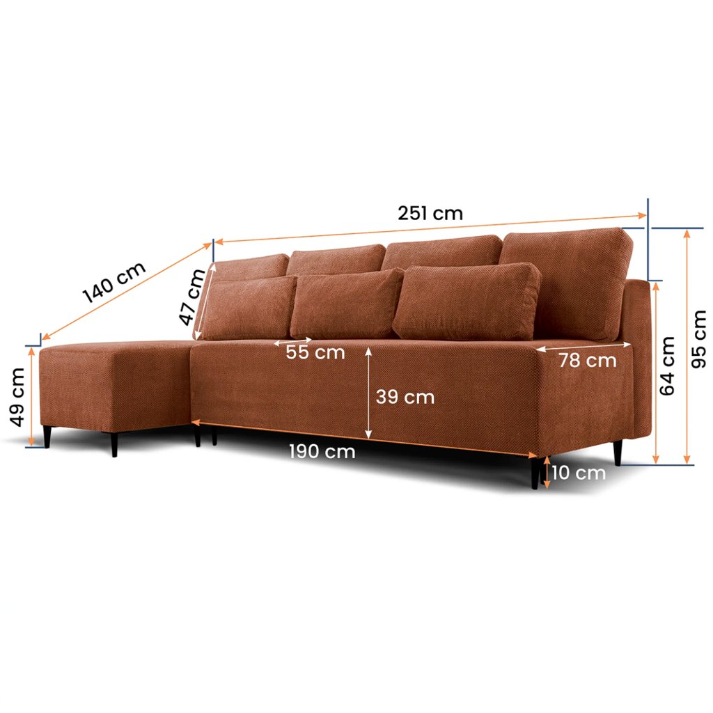 Rohová sedací souprava MAROKO ve tvaru L je spolehlivým parťákem do každého obýváku. Nabízí pohodlné sezení pro rodinu i návštěvy – a když se večer protáhne, snadno ji rozložíš na prostorné lůžko. Uvnitř se skrývá praktický úložný prostor, kam se vejdou deky, peřiny nebo třeba tvoje oblíbené dobroty. Potahy jsou ušité z tkanin s certifikací OEKO-TEX®, takže si můžeš být jistý, že jsou šetrné k tobě i k přírodě. A aby ladila i s tvým vkusem? Vyber si barvu látky – sedačku nabízíme v několika elegantních variantách.