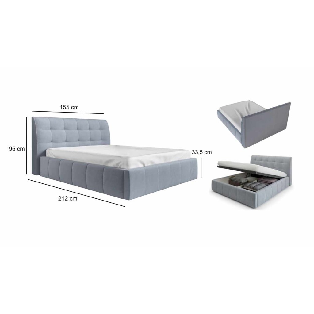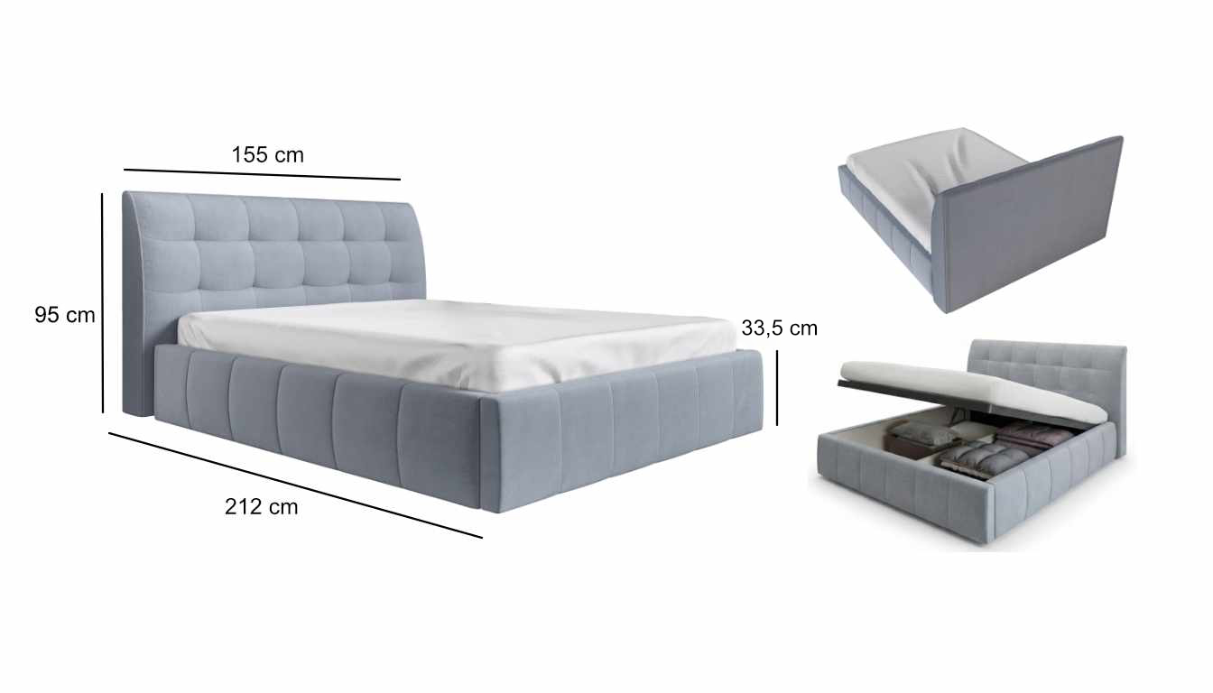 155 cm (šířka) × 212 cm (hloubka) × 95 cm (výška čela) x 33,5 cm (výška)