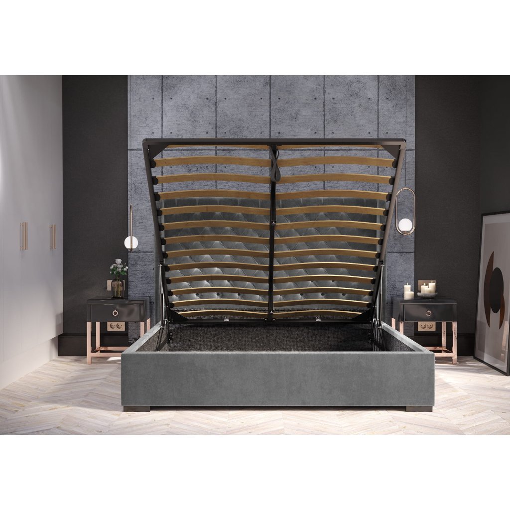 Moderní čalouněná postel ze série Riami s lamelovým roštem, bez matrace, s úložným prostorem.