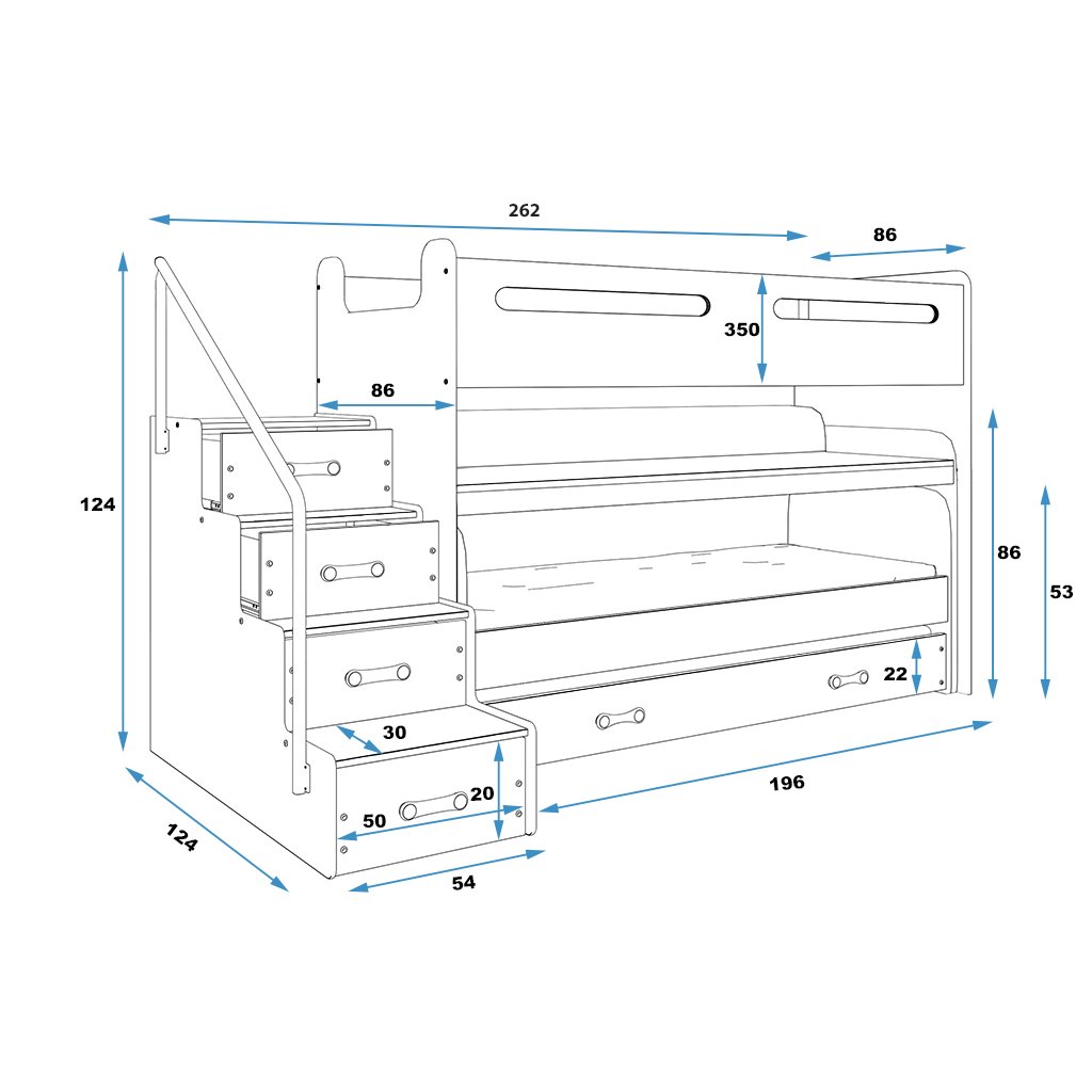 | Funkce/vybavení: | S úložným prostorem, Se šuplíky, Se schody, S psacím stolem, S přistýlkou, Pro 3 děti |
