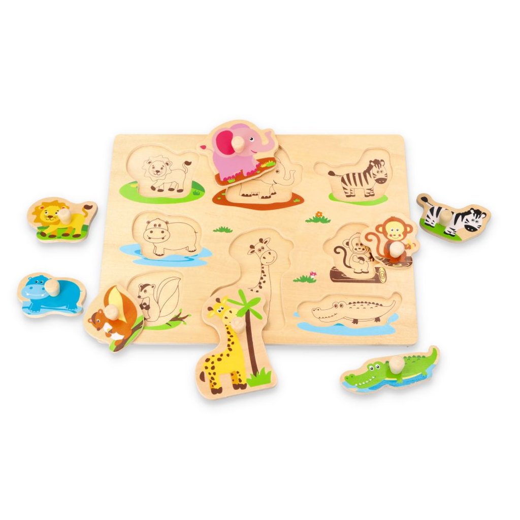 Puzzle je vyrobeno z přírodního dřeva a obsahuje 7 zvířátek z džungle.