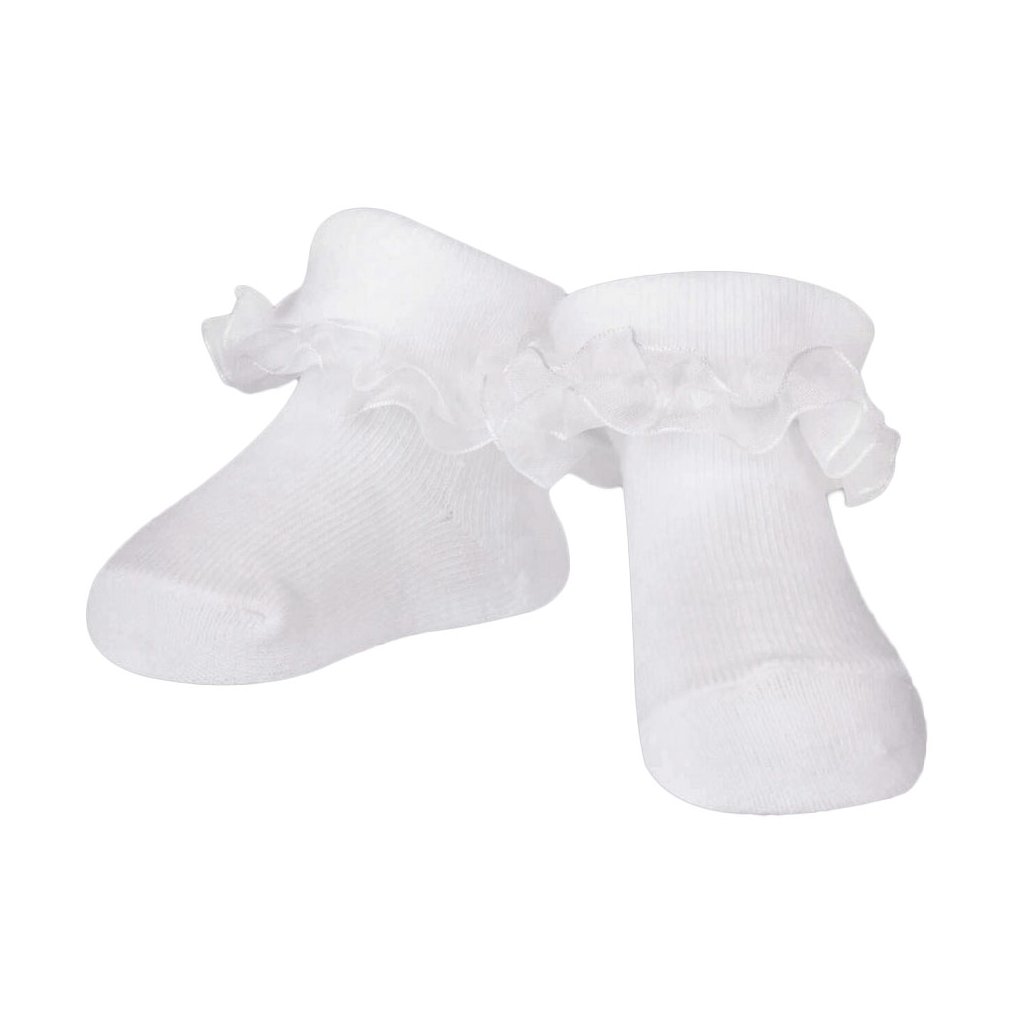 Krásné kojenecké ponožky s krajkou v bílé barvě jsou určené pro miminka ve věku 0 - 3 měsíců.