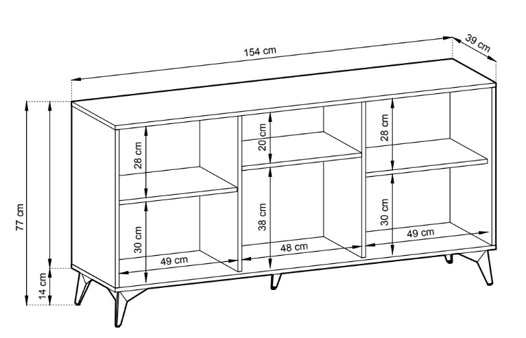 Komoda je široká 154 cm, nabízí dostatek úložného prostoru v podobě tří uzavřených polic za dvířky.