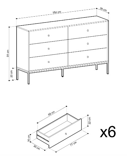 Komoda je široká 154 cm, nabízí dostatek úložného prostoru v podobě šesti zásuvek.