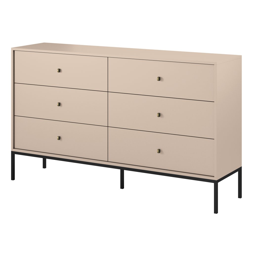 Představte si nejen moderní, ale také funkční kus nábytku, který se stane středobodem Vašeho obývacího pokoje - moderní komoda NOMO. Tento kousek nábytku je dokonalým spojením moderních prvků v dekoru Béžová s vysokými kovovými nohami v černé barvě a se zlatými úchytky ve tvaru knoflíků.