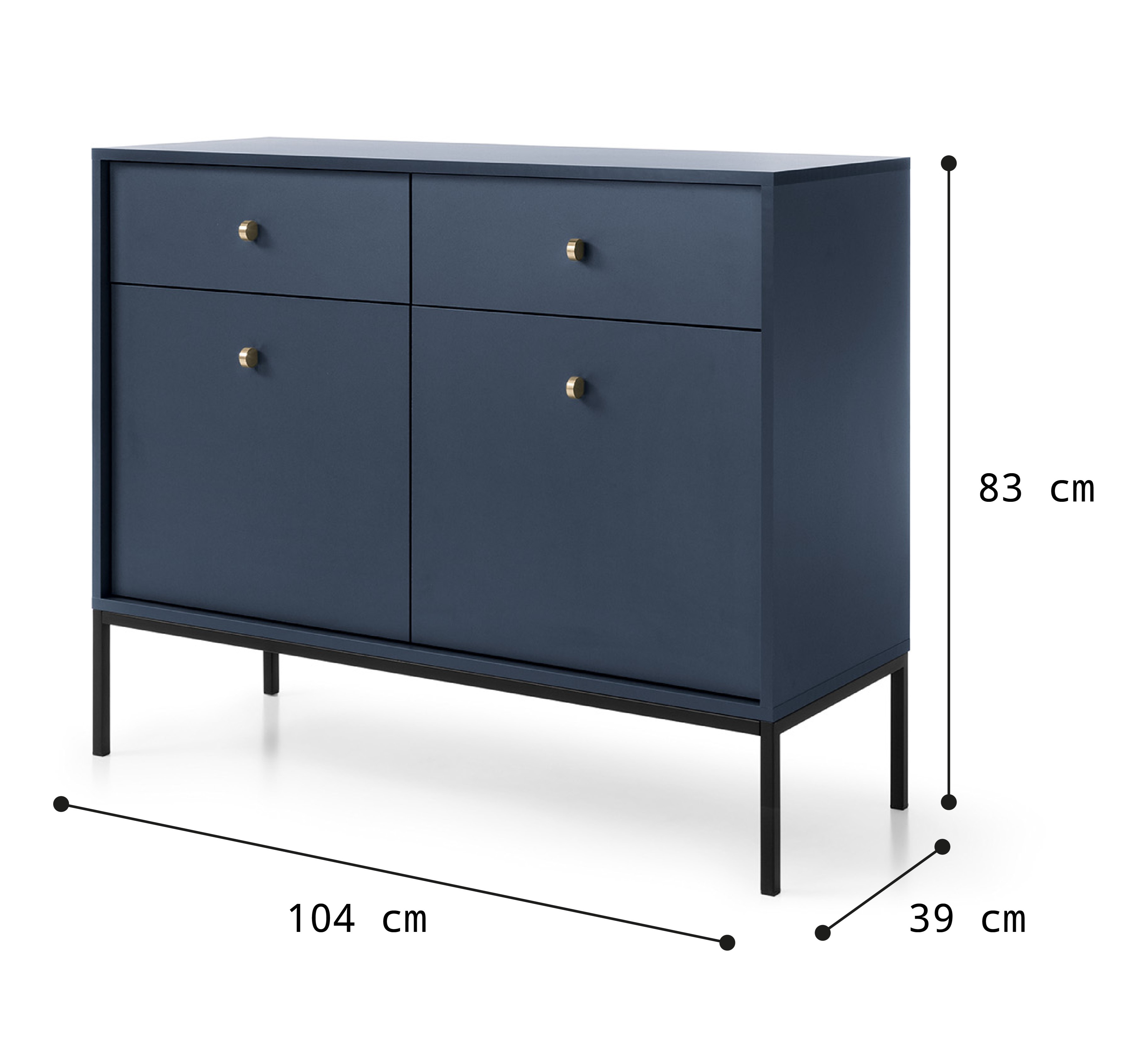 Komoda je široká 104 cm, nabízí dostatek úložného prostoru v podobě dvou zásuvek a dvou uzavřených polic za dvířky.