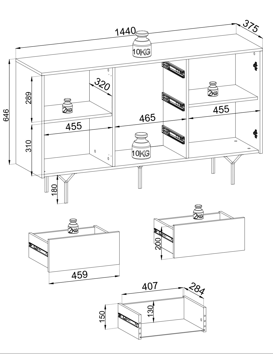 Komoda je široká 144 cm, nabízí dostatek úložného prostoru v podobě tří zásuvek zásuvky a dvou uzavřených police za dvířky.