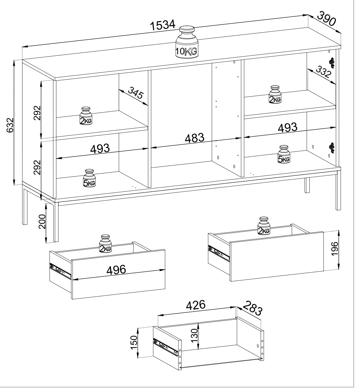 Komoda je široká 154 cm, nabízí dostatek úložného prostoru v podobě tří zásuvek a dvou uzavřených polic. Nábytek je osvětlen pomocí LED osvětlení.
