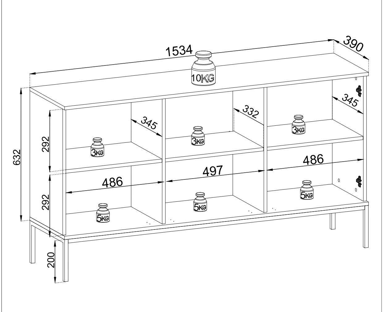 Komoda je široká 154 cm, nabízí dostatek úložného prostoru v podobě tři uzavřených polic za dvířky. Nábytek je osvětlen pomocí LED osvětlení.