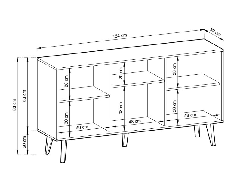 Komoda je široká 154 cm, nabízí dostatek úložného prostoru v podobě tří uzavřených polic