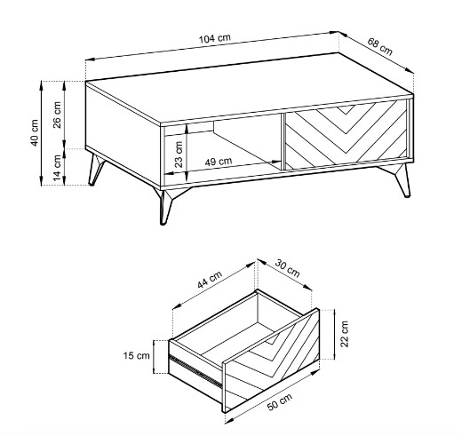 Konferenční stolek je široký 104 cm, nabízí dostatek úložného prostoru v podobě otevřené police a dvou zásuvek.