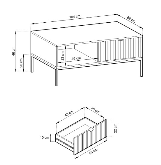 Konferenční stolek je široký 104 cm, nabízí dostatek úložného prostoru v podobě dvou zásuvek a jedné otevření police.
