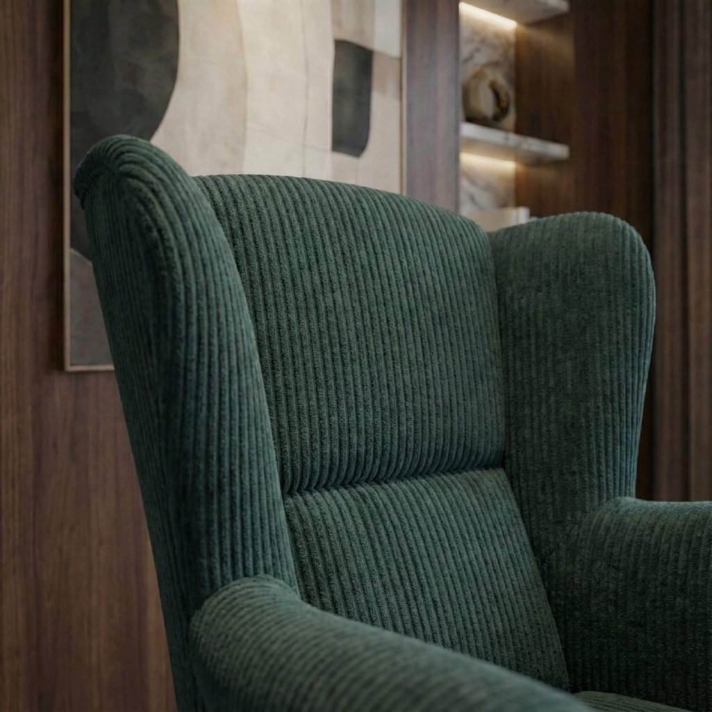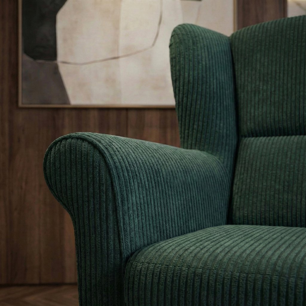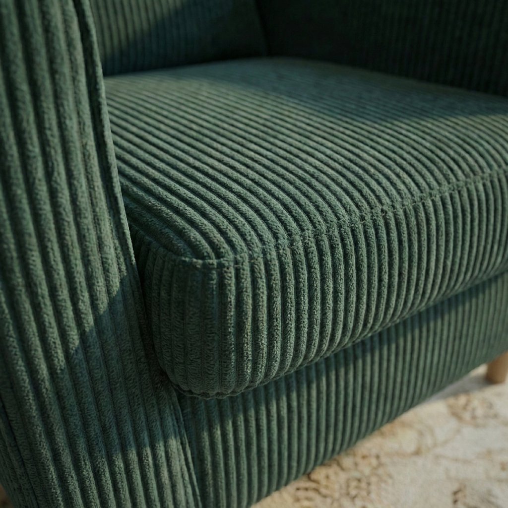 Stínování: Látka Poso má jemnou manšestrovou strukturu – při pohybu rukou se mění odlesk a textura, což vytváří přirozenou hloubku a zajímavý vizuální efekt nábytku.