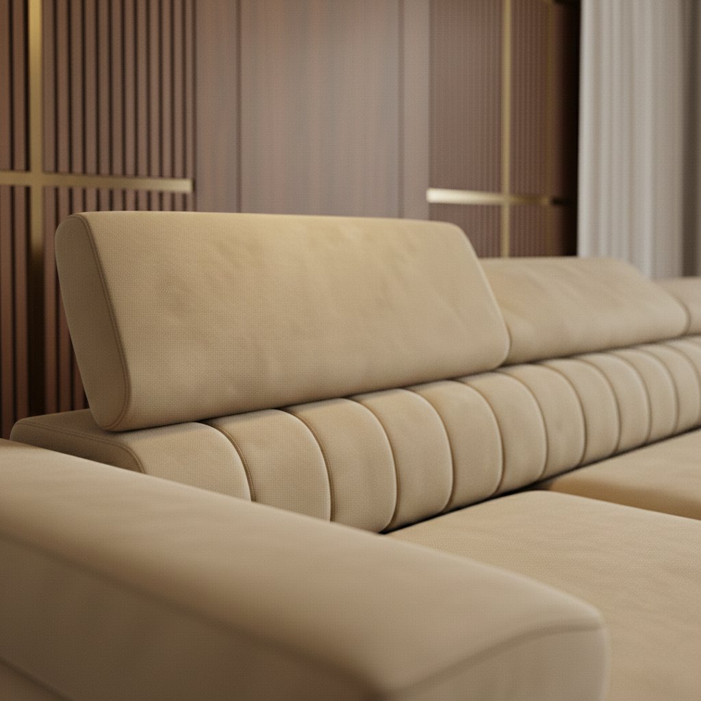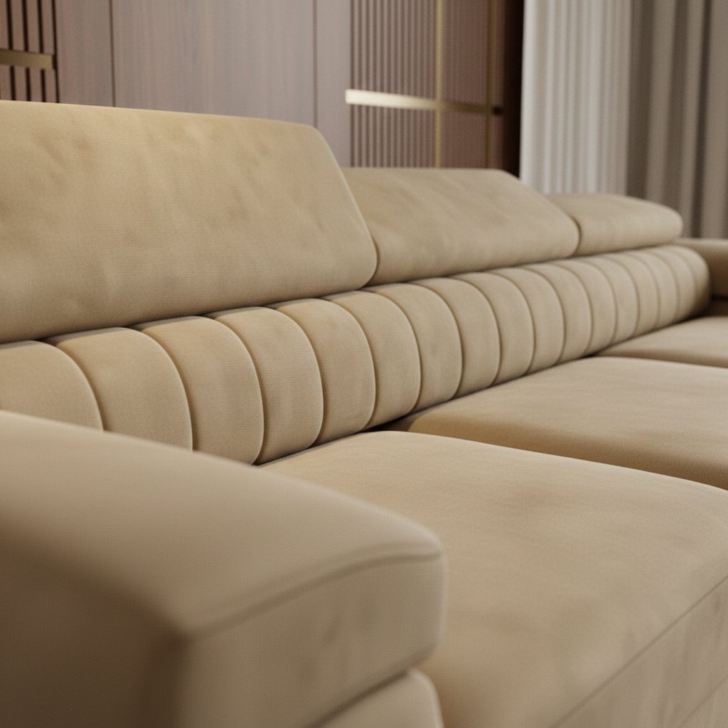 Stínování: Látka Kronos má jemně sametový, hladký povrch s lehkým vlasem – při dopadu světla a změně směru pohledu se odstín mírně proměňuje, což vytváří elegantní stínování a dodává nábytku pocit hloubky a luxusního vzhledu.