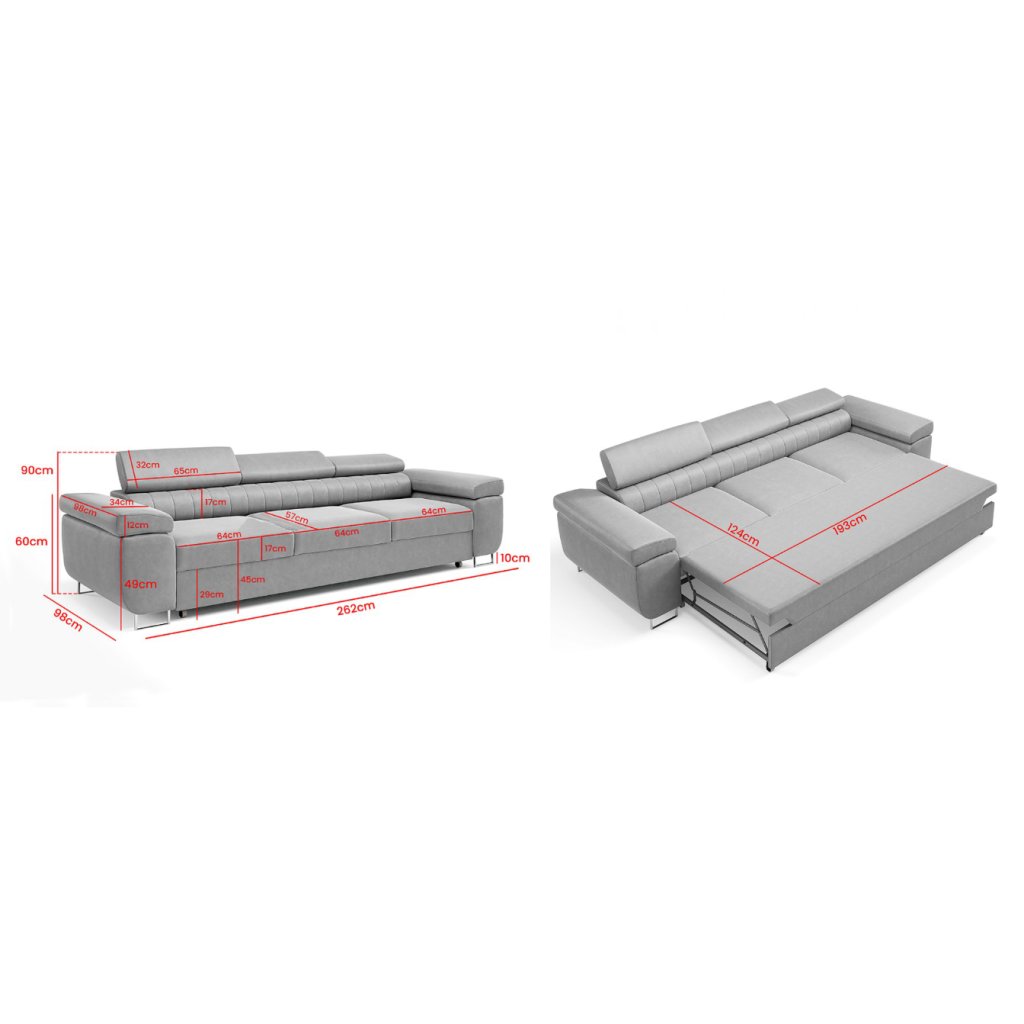 262 cm (šířka) × 98 cm (hloubka) × 90 cm (výška) | 193 x 124 cm (spací plocha)