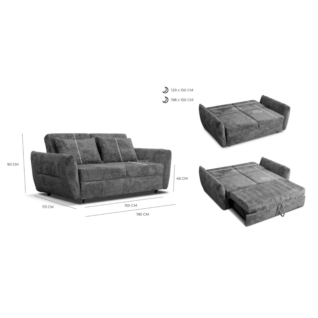 150 cm (šířka) × 113 cm (hloubka) × 90 cm (výška) | 129 x 150 cm + 198 x 150 cm (spací plocha)