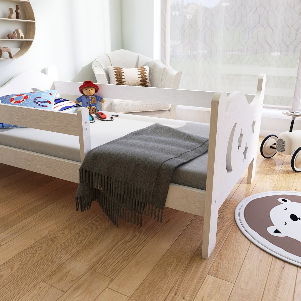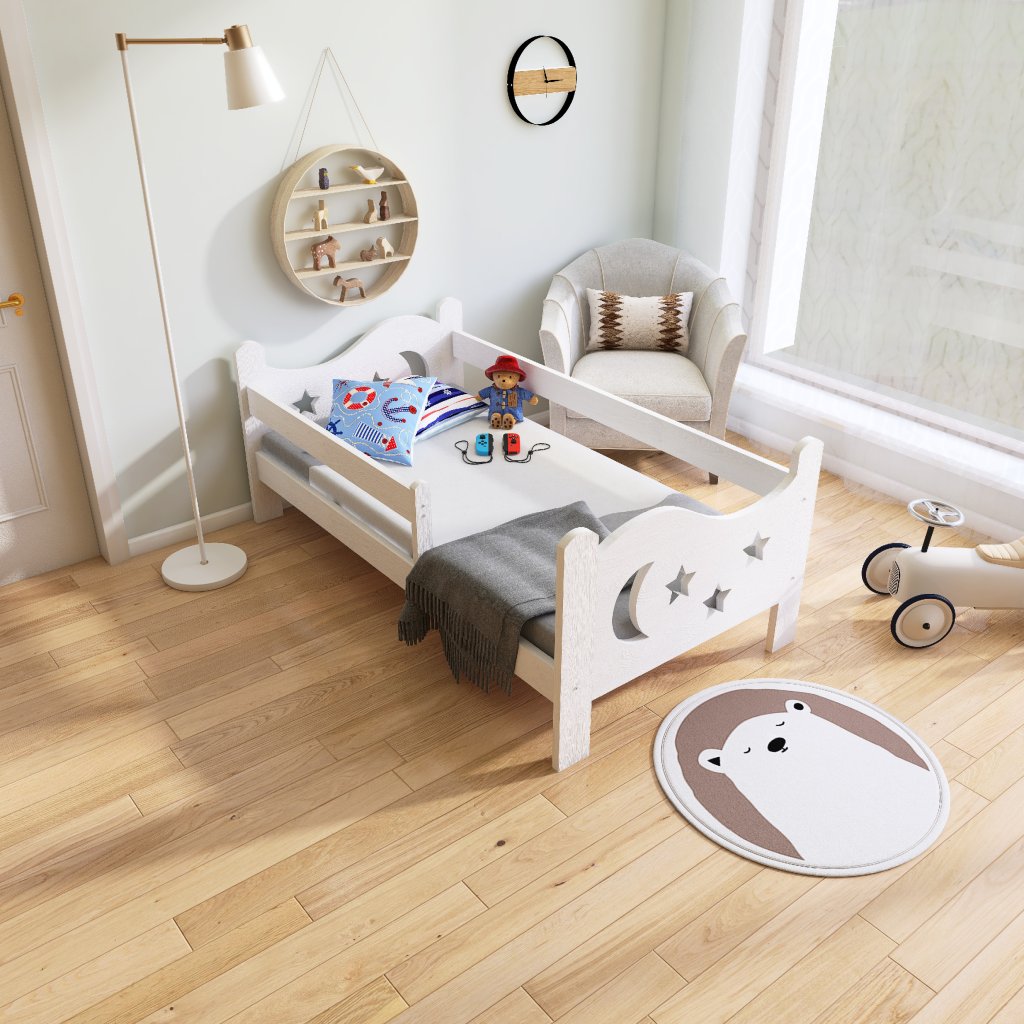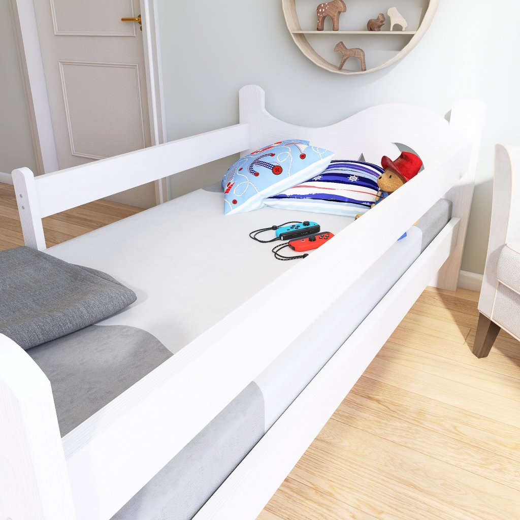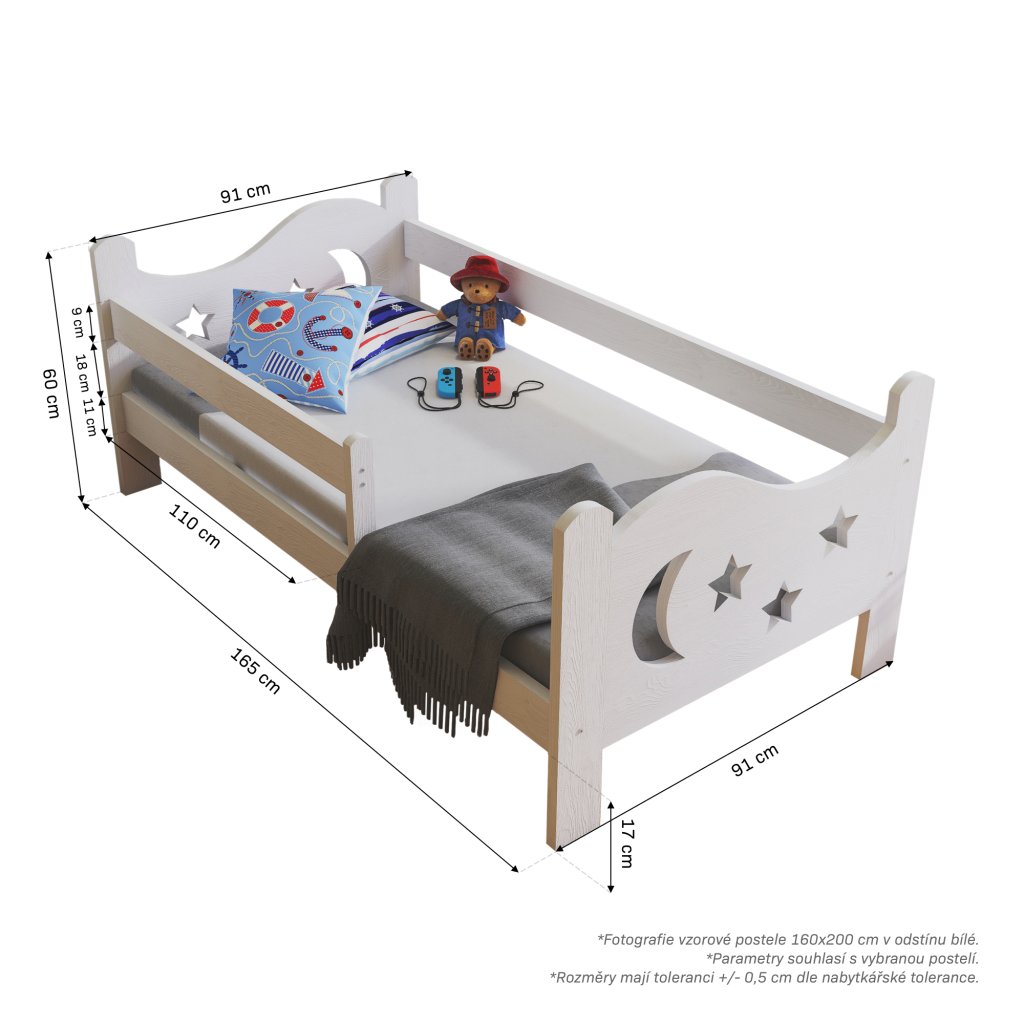 Postel Bohoušek pro větší děti s ochrannou bariérkou, která chrání dítě před pádem. Součástí postele je bariérka, kterou lze přidělat na libovolnou stranu. Bariérka je možno demontovat