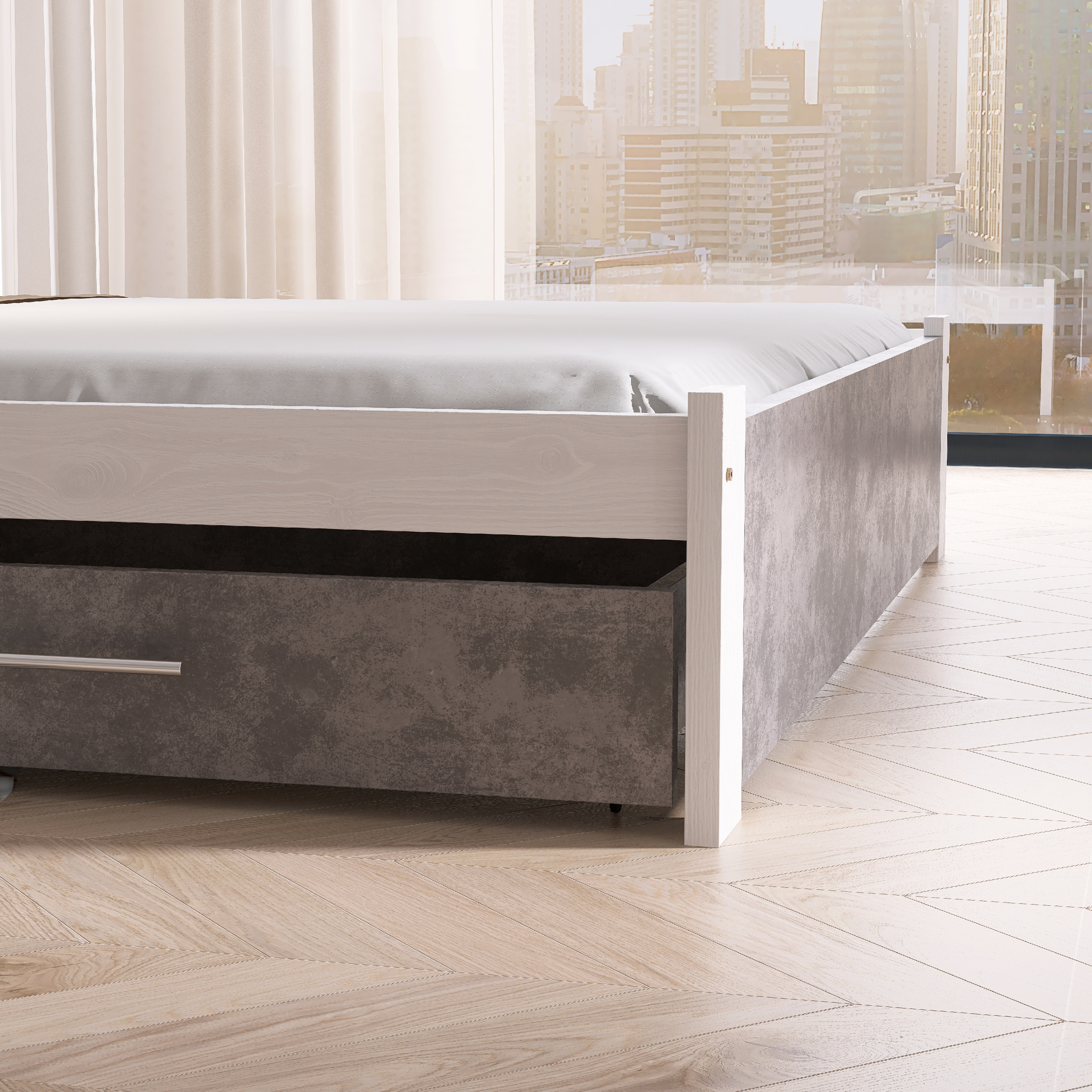 Rám postele a úložný prostor.