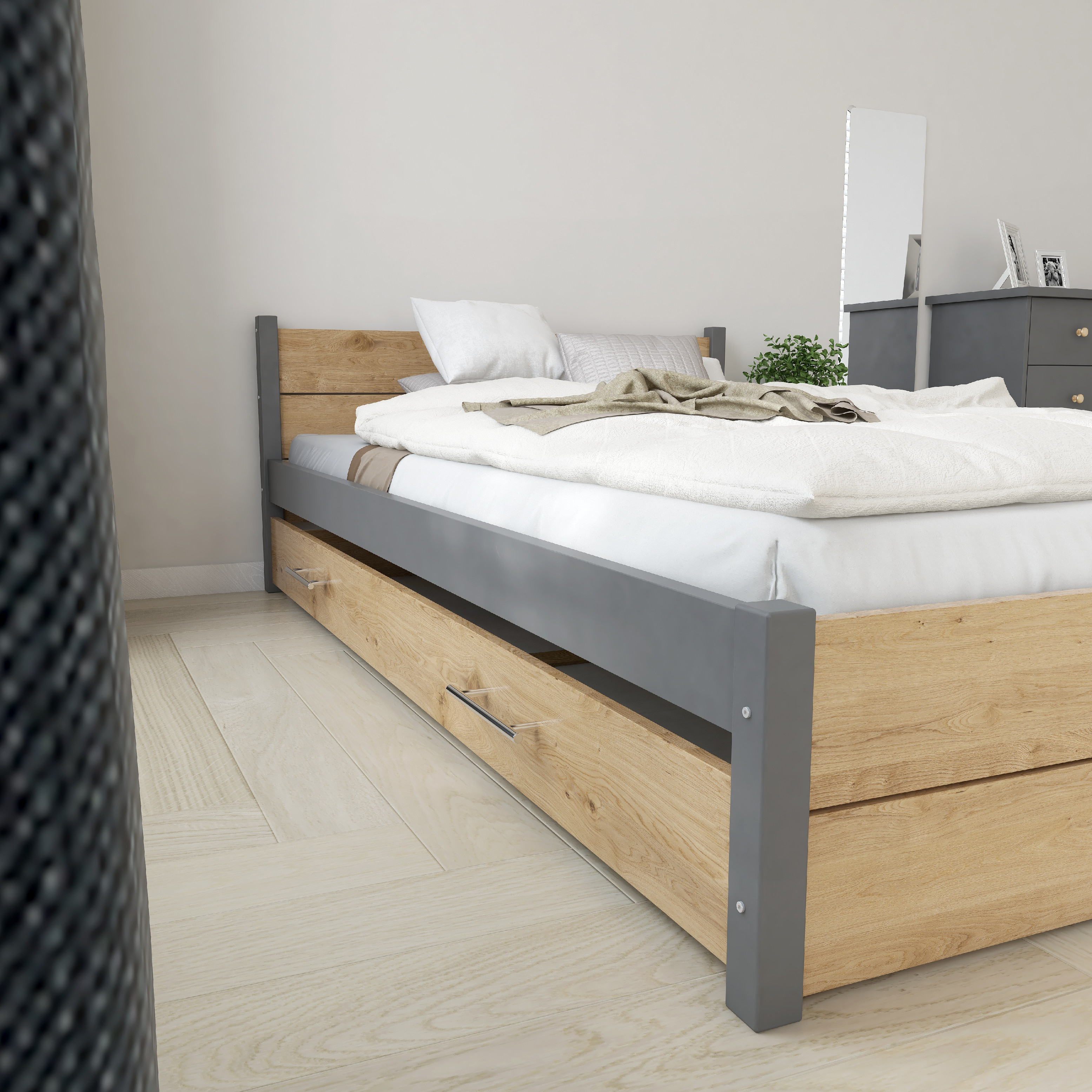 Rám postele a úložný prostor.