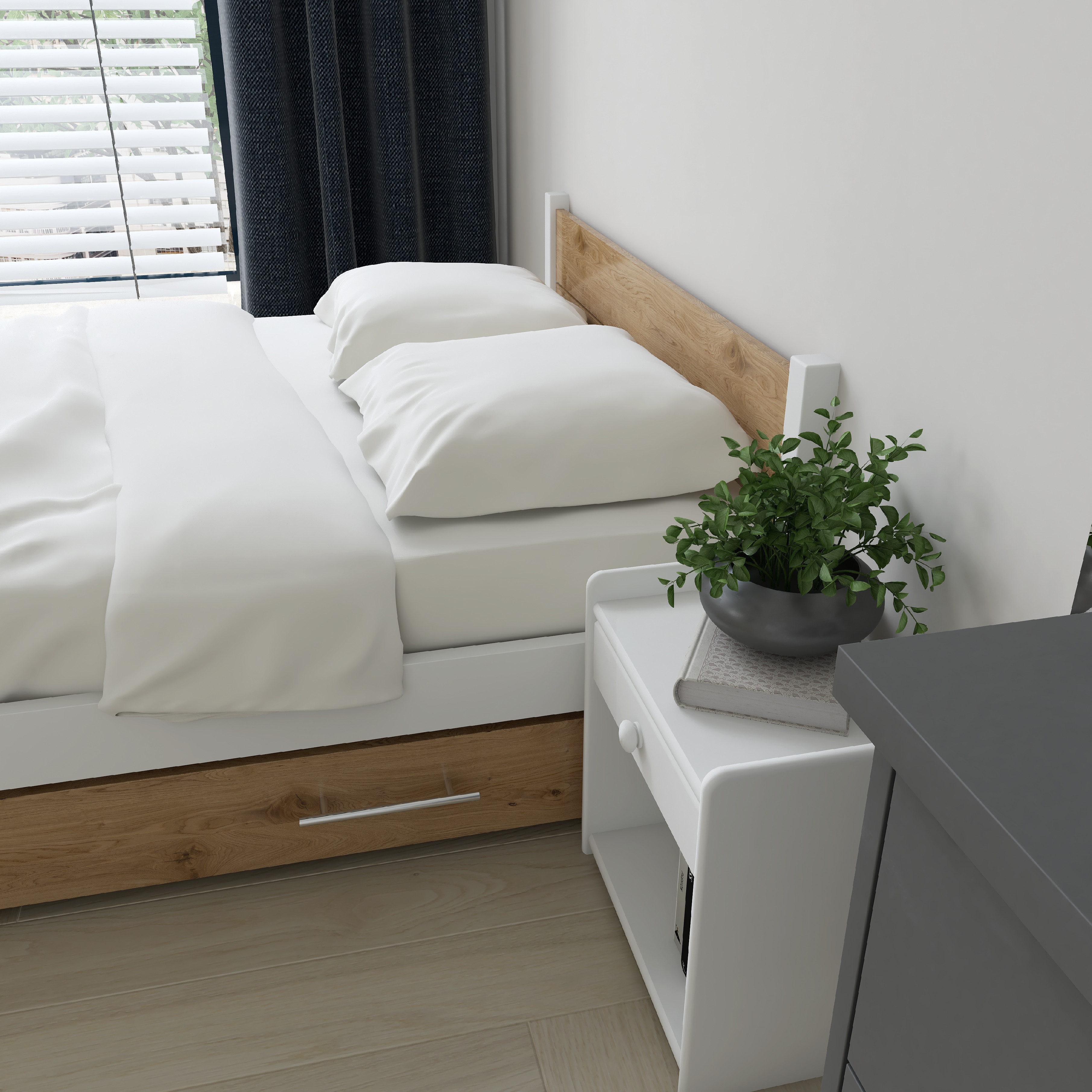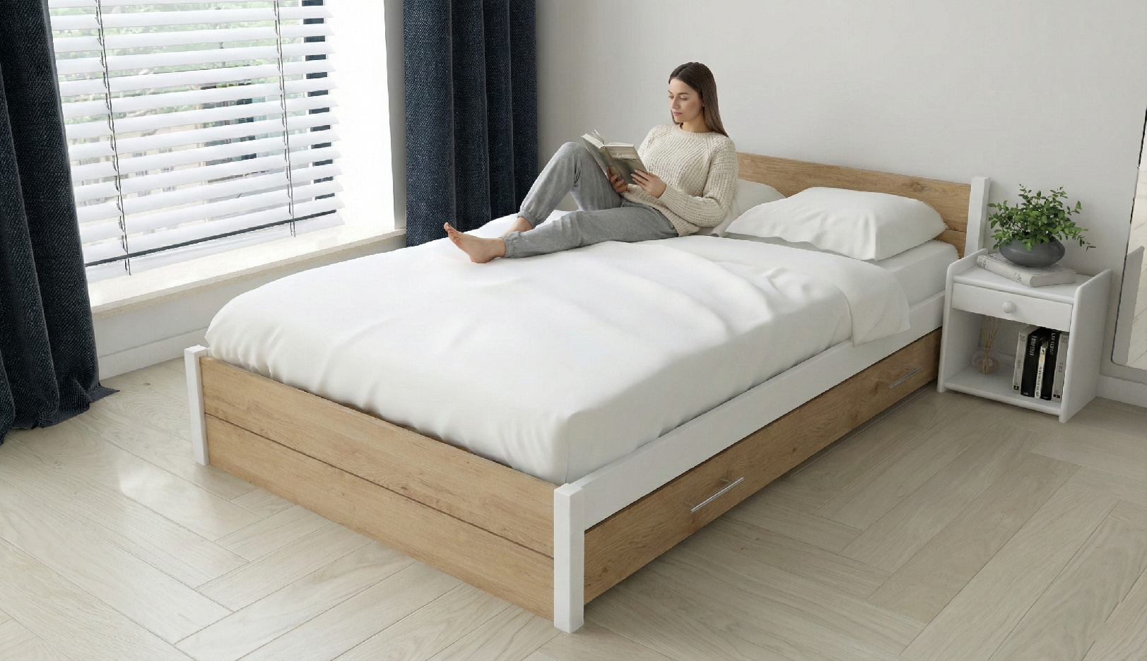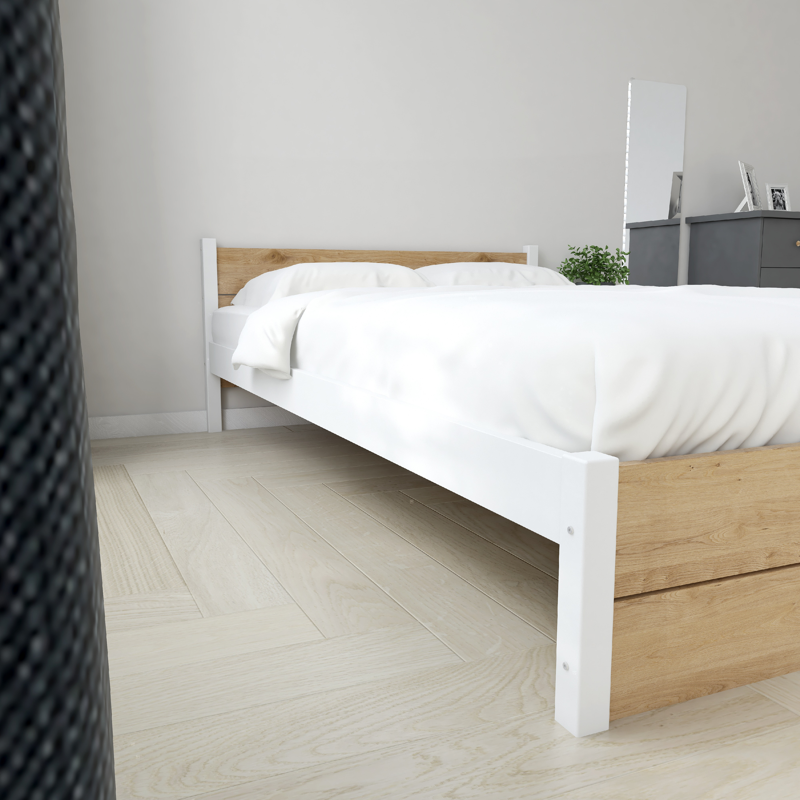 Rám postele a úložný prostor.