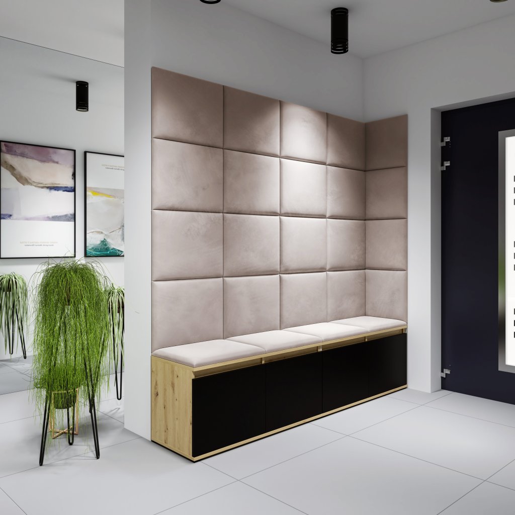 Předsíňová stěna s čalouněnými panely Trinity 3 - Dub Artisan s černou / Tmavá krémová 2302