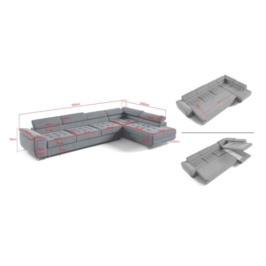 331 cm (šířka) × 200 cm (hloubka) × 90 cm (výška) | 125 x 250 cm (spací plocha)