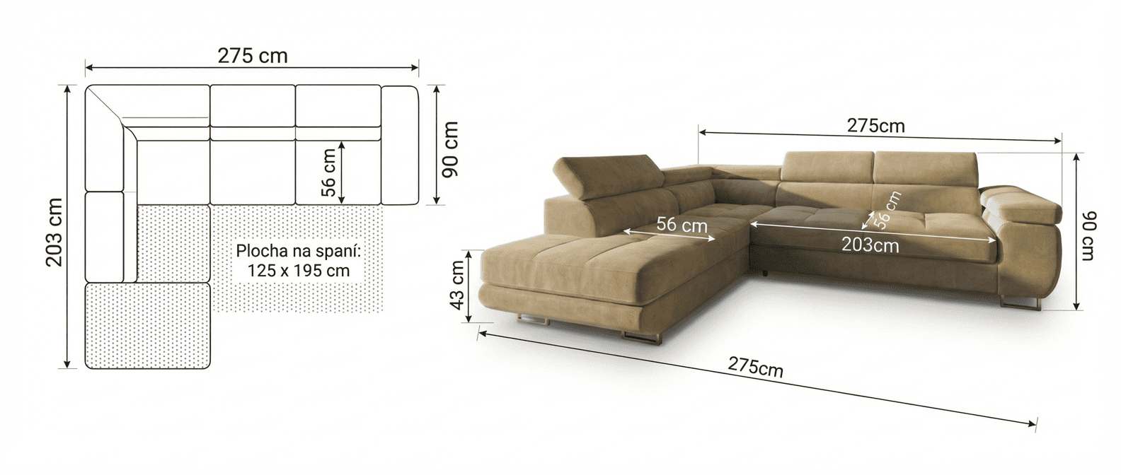 275 cm (šířka) × 202 cm (hloubka) × 90 cm (výška)