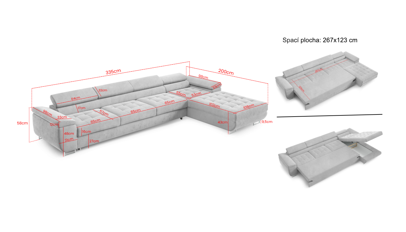 335 cm (šířka) × 200 cm (hloubka) × 90 cm (výška) | 123 x 267 cm (spací plocha)