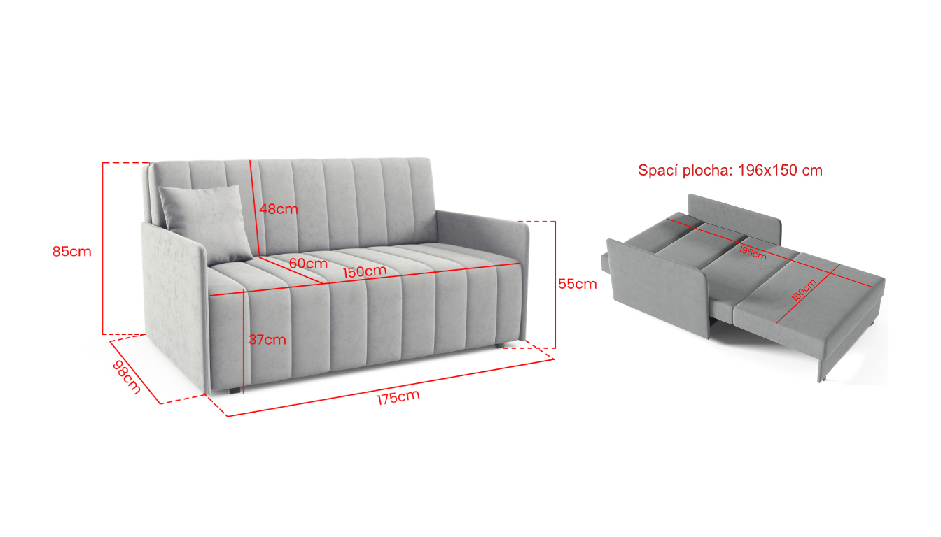 175 cm (šířka) × 98 cm (hloubka) × 85 cm (výška) | 196 x 150 cm (spací plocha)