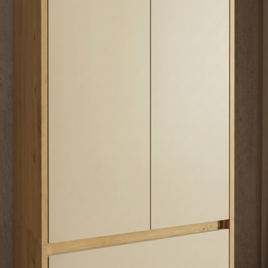 Elle není jen skříň. Je to promyšlený kus nábytku, kde se čistý design setkává s praktickým využitím. Precizní zpracování, praktické TIP-ON otevírání bez madel a otočné dveře vytvářejí funkční celek, který přirozeně zapadne do moderního interiéru. Díky vyváženým proporcím a kombinaci dvou dekorů se skříň snadno přizpůsobí prostoru i vašemu stylu a nabídne přehledné řešení pro každodenní ukládání.