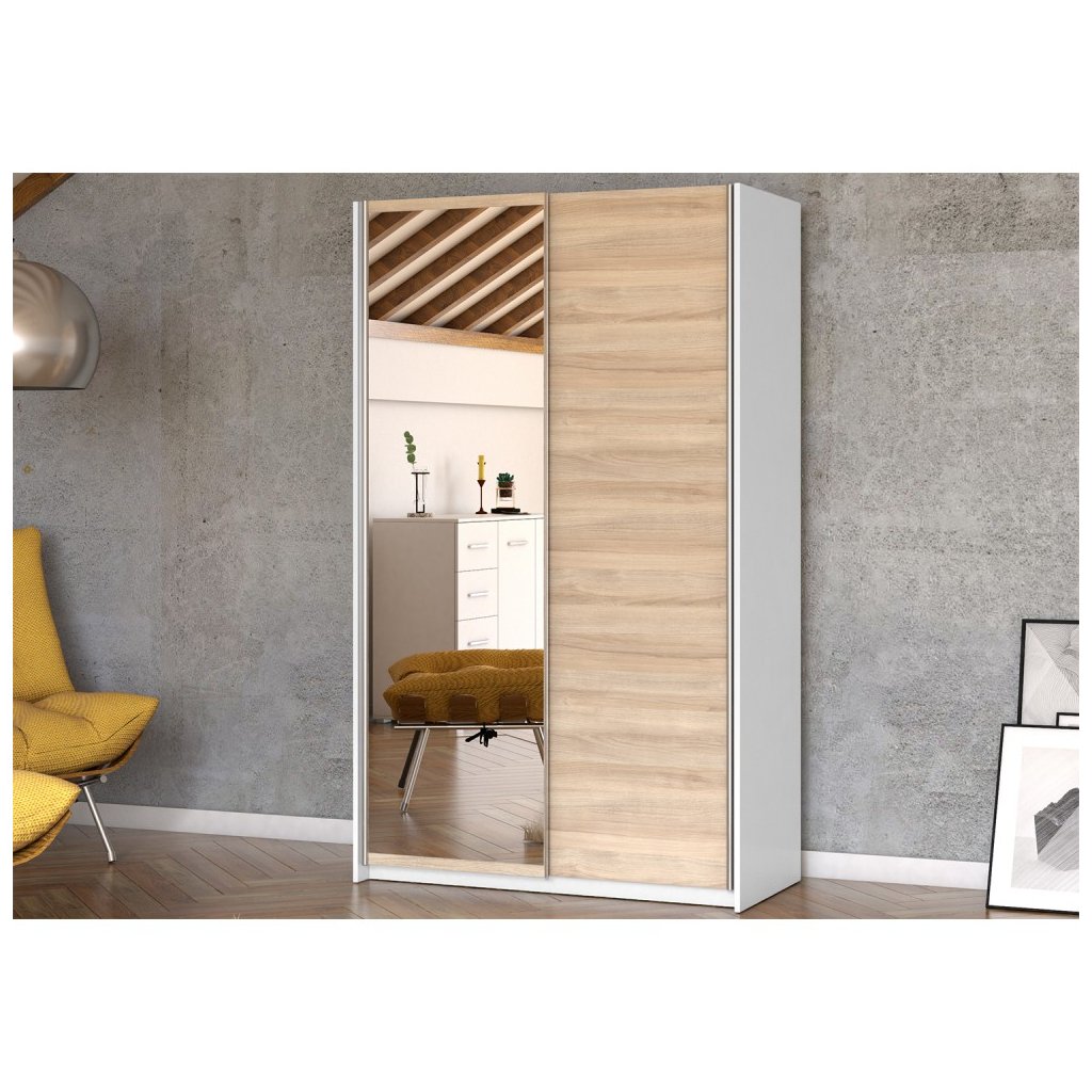 Šatní skříň Hit je moderní posuvná skříň v módních barevných kombinacích. Hodí se do mnoha interiérů, šatní skříň má systém zavěšených posuvných dveří, který usnadňuje používání a nezabírá místo. Je rozdělena na dvě části, vybavená dvěma tyčemi a policemi nad nimi. Zrcadlo umístěné na přední straně místnost prosvětlí a opticky zvětší.