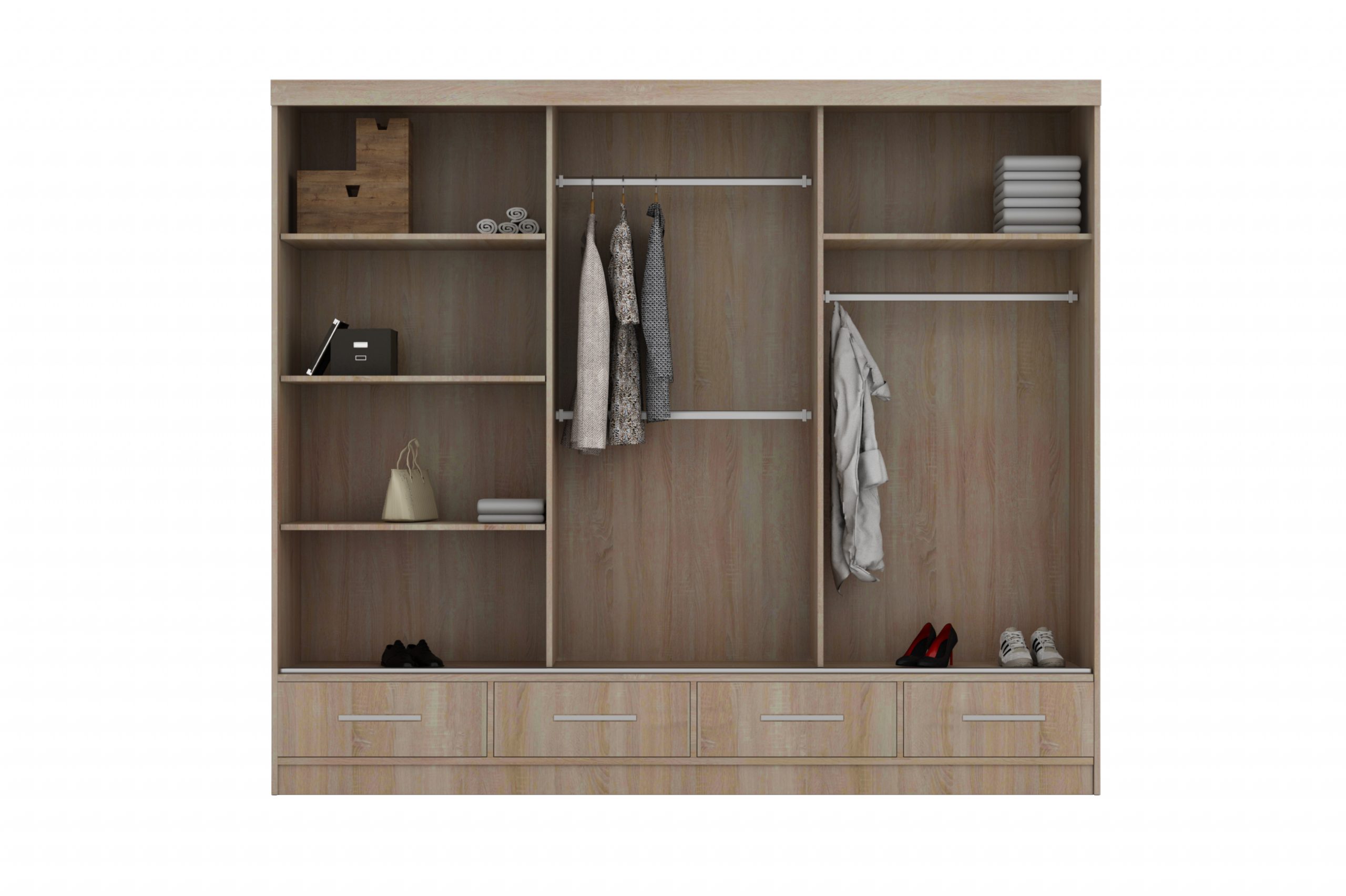 Šatní skříň disponuje posuvným systém otevírání dveří. Tento systém nejenže zajišťuje plynulé a tiché otevírání dveří, ale také výrazně šetří prostor ve srovnání s tradičními otevíracími mechanismy.