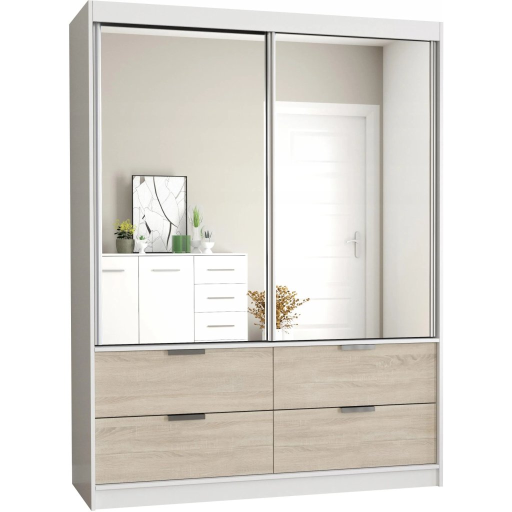 Vela – prostorná dvoudveřová skříň s posuvnými dveřmi, čtyřmi praktickými šuplíky a velkým zrcadlem. Elegantní kombinace dubu sonoma a bílé pro dokonalý pořádek.