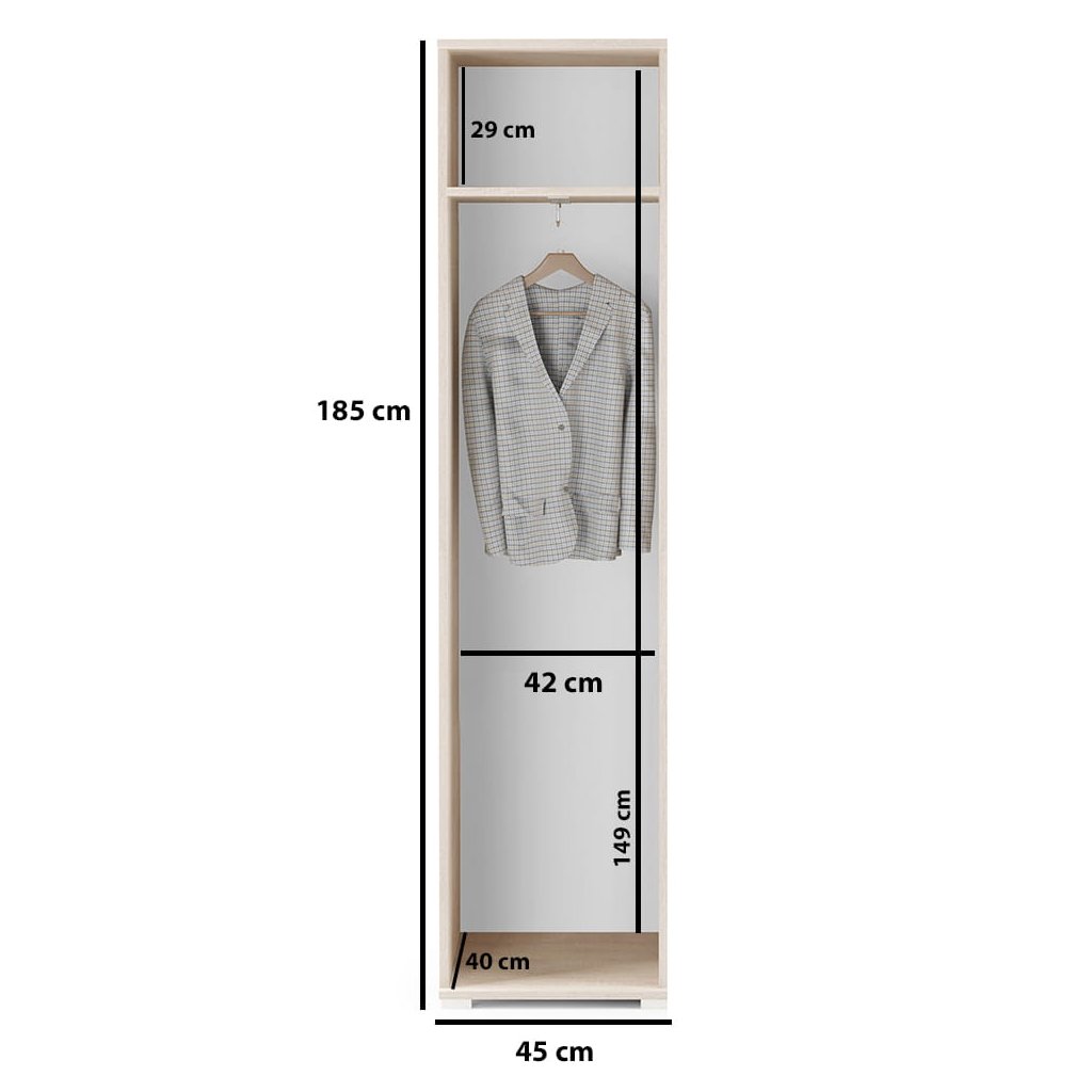 Jednokřídlá skříň s velký horním odkládacím prostorem a závěsnou tyčí pro ramínka na kabáty.