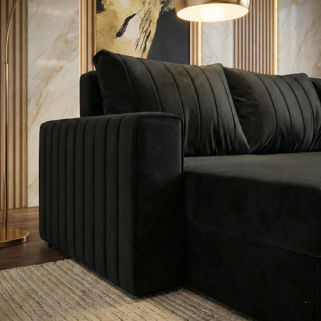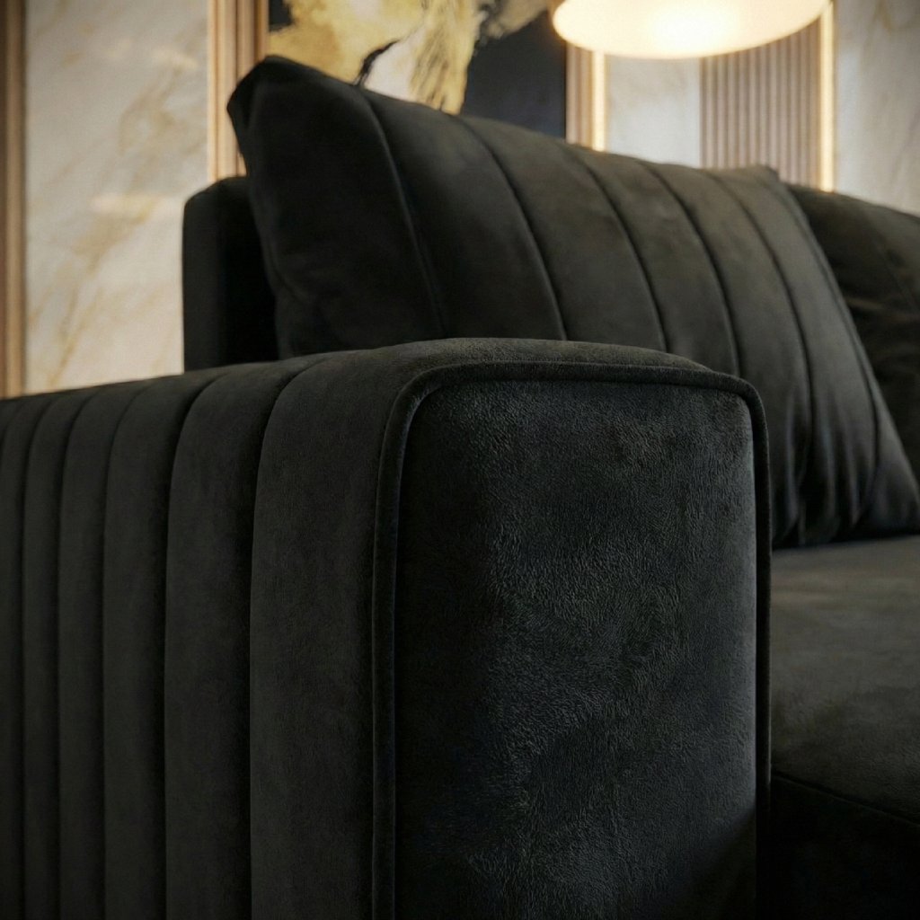 Stínování: Látka Kronos má jemně sametový, hladký povrch s lehkým vlasem – při dopadu světla a změně směru pohledu se odstín mírně proměňuje, což vytváří elegantní stínování a dodává nábytku pocit hloubky a luxusního vzhledu.