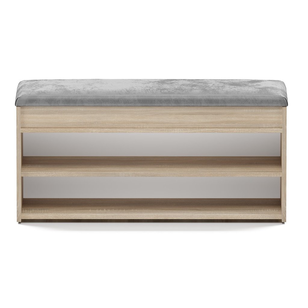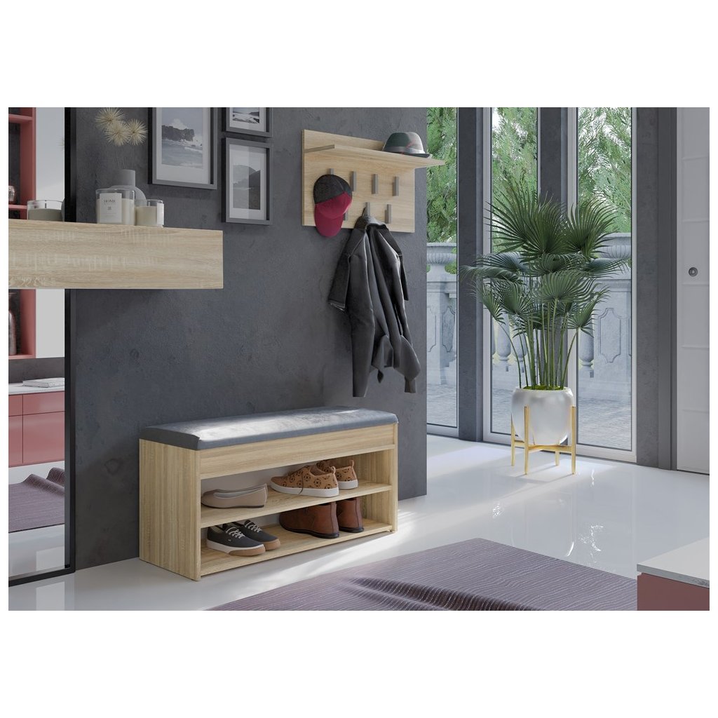 Pohodlná skříň na obuv s čalouněný sedák a úložný prostor na pomůcky. K dispozici jsou také 2 police na boty.