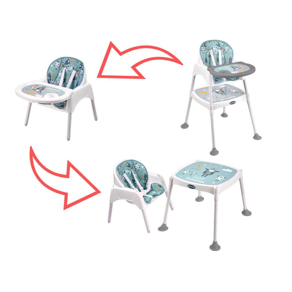 Skvělá dětská jídelní židlička 3v1, která má tři různé funkce - vysoká židle, židle a stoleček. Židle je lehká, měkká a snadno použitelná. Krásný design upoutá pozornost batolete. Měkký potah zajistí pohodlné sezení pro vaše miminko.