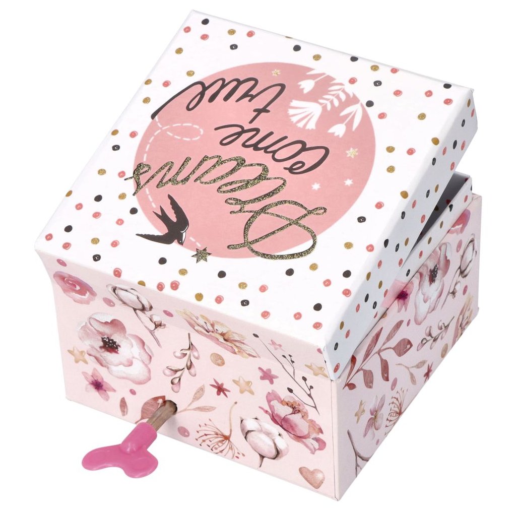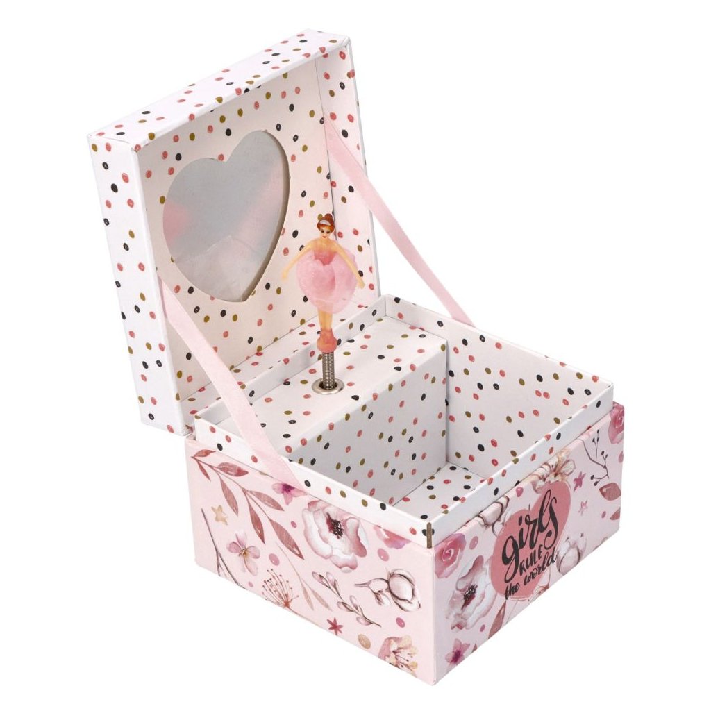 Hrací skříňka v růžové a bílé barvě s krásnými květy po stranách. V hlavní roli krásná, třpytivá baletka ve všech barvách duhy. Nádherné šaty, ve kterých je oblečená, dodávají charakter baletky a zrcadlo na zadní stěně působí dojmem, že se účastníme podívané ve velké aréně. Tentokrát hrací skříňka bez dalších přihrádek a šuplíků, ale místa je uvnitř dost.