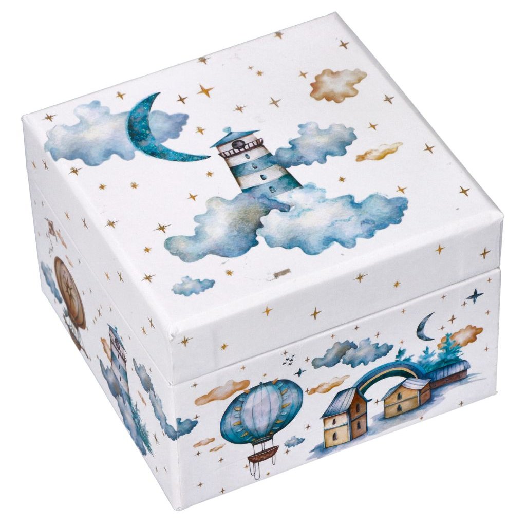 Hrací skříňka s tématem říše snů - po jejích stranách najdete mraky, měsíc a maják. Doplňkem je malá vesnice a balónová vzducholoď s třpytivými hvězdami viditelnými v pozadí. Měsíc zdobený třpytivými zelenomodrými třpytkami dodává hrací skříňce jemnou, ale ne příliš přehnanou jiskru. V hlavní roli krásná, třpytivá baletka ve všech barvách duhy.