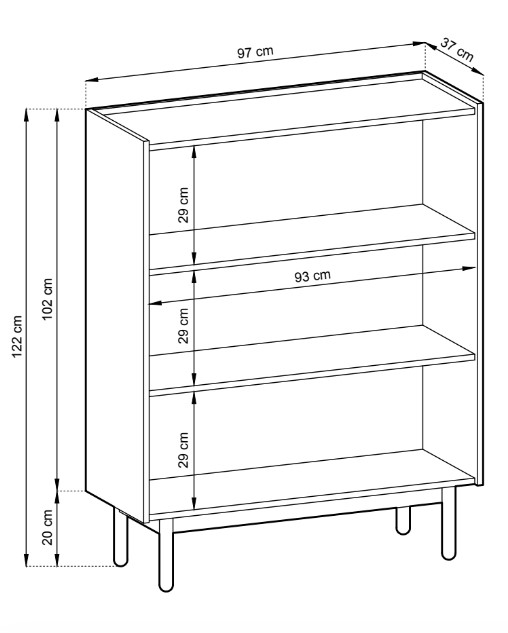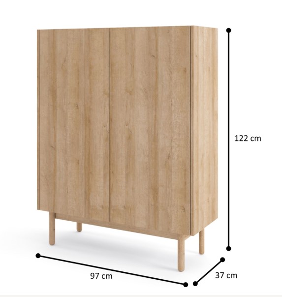 Komoda je široká 97 cm, nabízí dostatek úložného prostoru v podobě dvou uzavřených polic za dvířky. Vrchní plocha poslouží jako skvělé odkládací místo pro dekorace nebo knihy, které nespadnou díky vyvýšeným hranám.