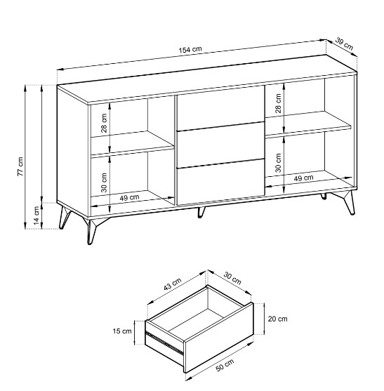 Komoda je široká 154 cm, nabízí dostatek úložného prostoru v podobě tří zásuvek a dvou uzavřených polic za dvířky.