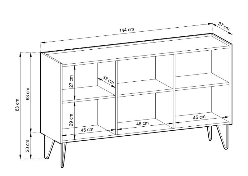 Komoda je široká 144 cm, nabízí dostatek úložného prostoru v podobě tří uzavřených polic za dvířky. Vrchní plocha poslouží jako skvělé odkládací místo pro dekorace nebo knihy, které nespadnou díky vyvýšeným hranám.
