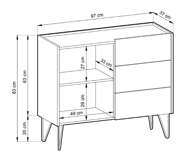 Komoda je široká 97 cm, nabízí dostatek úložného prostoru v podobě tří zásuvek a jedné uzavřené police. Vrchní plocha poslouží jako skvělé odkládací místo pro dekorace nebo knihy, které nespadnou díky vyvýšeným hranám.