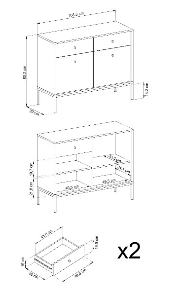 Komoda je široká 104 cm, nabízí dostatek úložného prostoru v podobě dvou zásuvek a dvou uzavřených polic za dvířky.