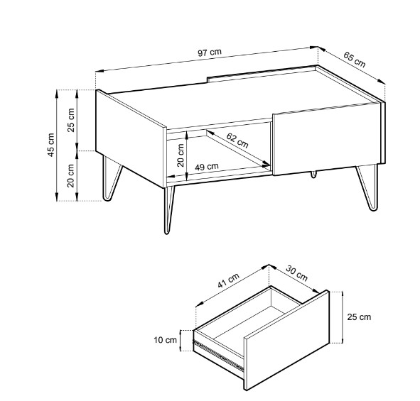 Konferenční stolek je široký 97 cm, nabízí dostatek úložného prostoru v podobě dvou zásuvek a jedné otevření police. Vrchní plocha poslouží jako skvělé odkládací místo pro dekorace nebo knihy, které nespadnou díky vyvýšeným hranám.