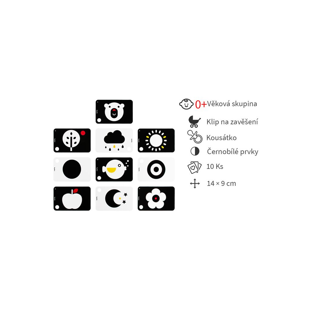Kontrastní karty jsou připevněny na plastovém kroužku - můžete je tedy ukazovat miminku samostatně, nebo je možné zavěsit kartičky i na postýlku, autosedačku nebo kočárek.