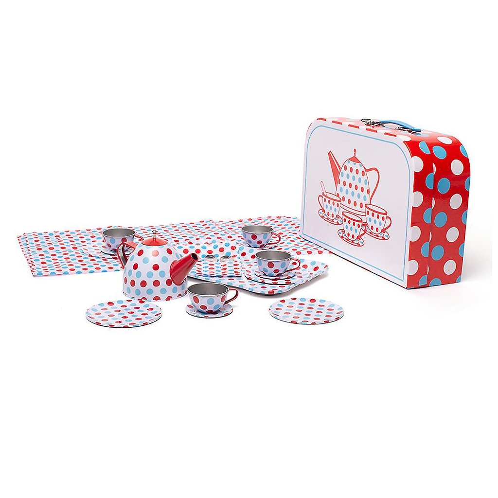 Tato nádherná tečkovaná dětská plechová čajová sada je pestře zbarvená a je dodávána s praktickým pouzdrem na odpolední čaj na cesty.
