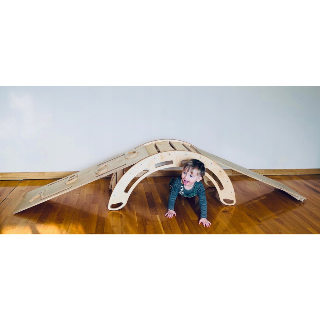 Houpačku je možné také doplnit o stylovou desku / klouzačku, kterou je možné díky drážkám připevnit k houpačce a tím vytvořit větší prolézačku i s klouzačkou. Díky bočních madel si může dítě pomoci a bez problému vylézt nebo sklouznout z prolézačky.