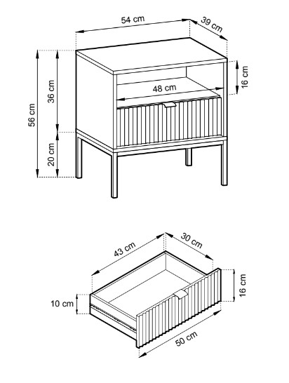 Noční stolek je široký 54 cm, nabízí dostatek úložného prostoru v podobě jedné zásuvky a jedné otevření police.