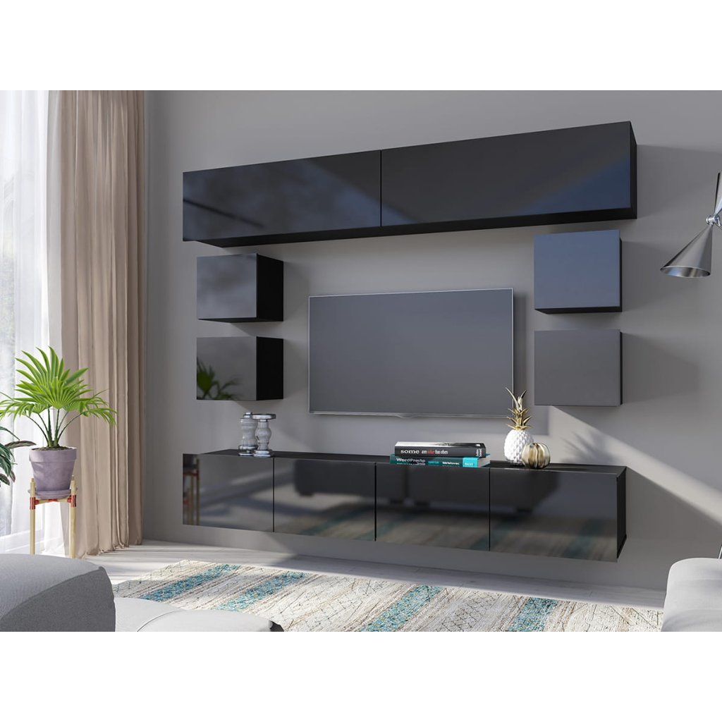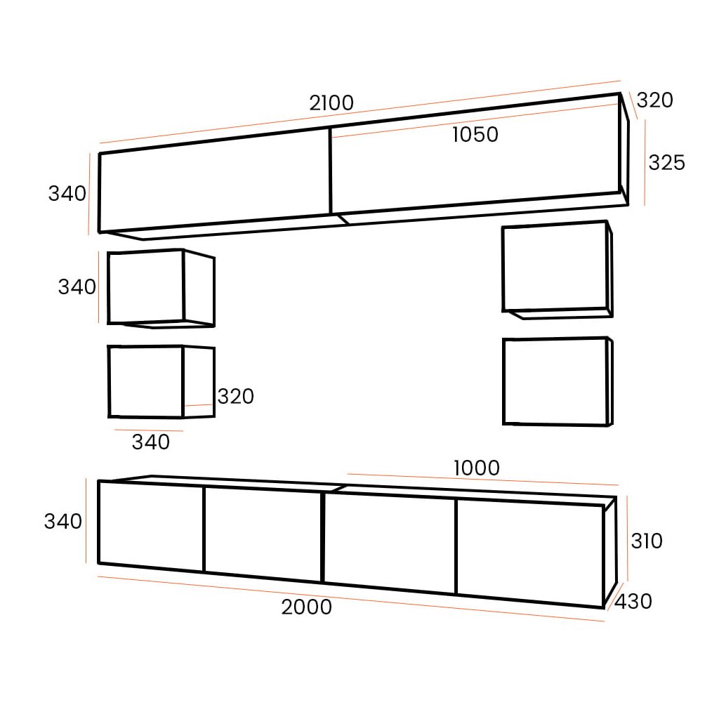 Sada se skládá ze 8 prvků. čtvercové skříně, televizní skříně a závěsné skříně.